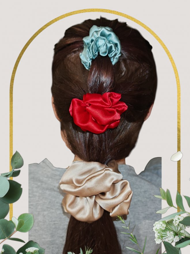 Hodvábne gumičky sú jemné, hypoalergénne a luxusné, držia cop perfektne a nepoškodzujú vlasy. Dostupné v rôznych farbách a veľkostiach (S, M, L).